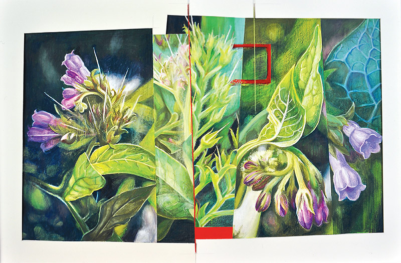A work included in the current exhibition Bettinson’s Maine at Mathias Fine Art in Boothbay, ME. B. Bettinson, Comfrey, 2002, water-based media, 26 x 39″. Photo: Melville McLean. © Mathias Fine Art, 2002 & 2025.