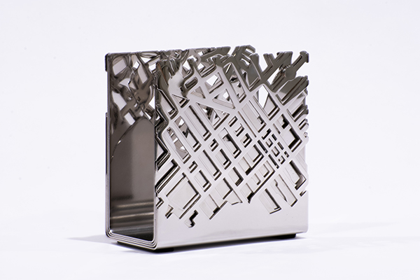It was 2022 before the self-funded production process was refined enough for the chairs to be shown and marketed as the Galante Design Studio’s “Atlas Obscured Collection.” By then, archival maps had been developed for Boston, Cambridge, and other cities around the world. Chairs that his firm makes of oak, cherry or walnut are meant to be indoors. Aluminum chairs for use outdoors are powder-coated electronically and baked in a range of colors to be durable in all weather. The chairs debuted between October 2024 and February 2025 at a pop-up gallery in Harvard Square at prices of $4,000 for wood ($5,000 for custom) and $9,000 for aluminum ($10,000 for custom). The line has since been extended to wall maps priced at $900 for wood and $350 for acrylic as well as napkin holders called mapkins for $500 in stainless steel. The wall maps, napkin holders, and chairs share vivid, cut-out surface patterns of street networks that vary by location and resemble abstract art.